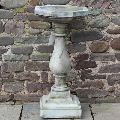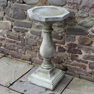 Octagonal bowl cast stone bird bath comprising of 2 pieces.